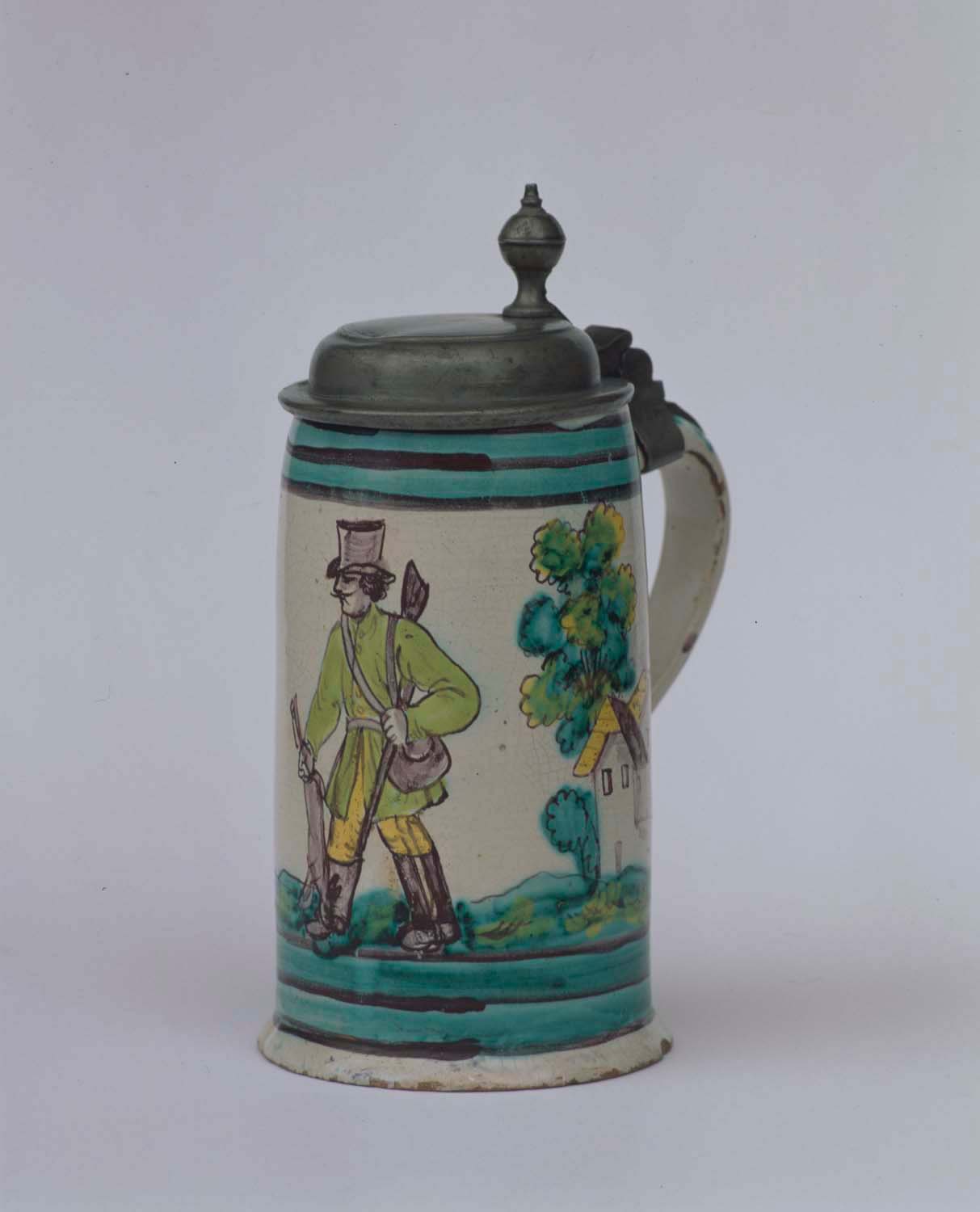Humpen mit montiertem Zinndeckel und Darstellung eines Jägers mit erleghtem Hasen in Landschaftsszene.