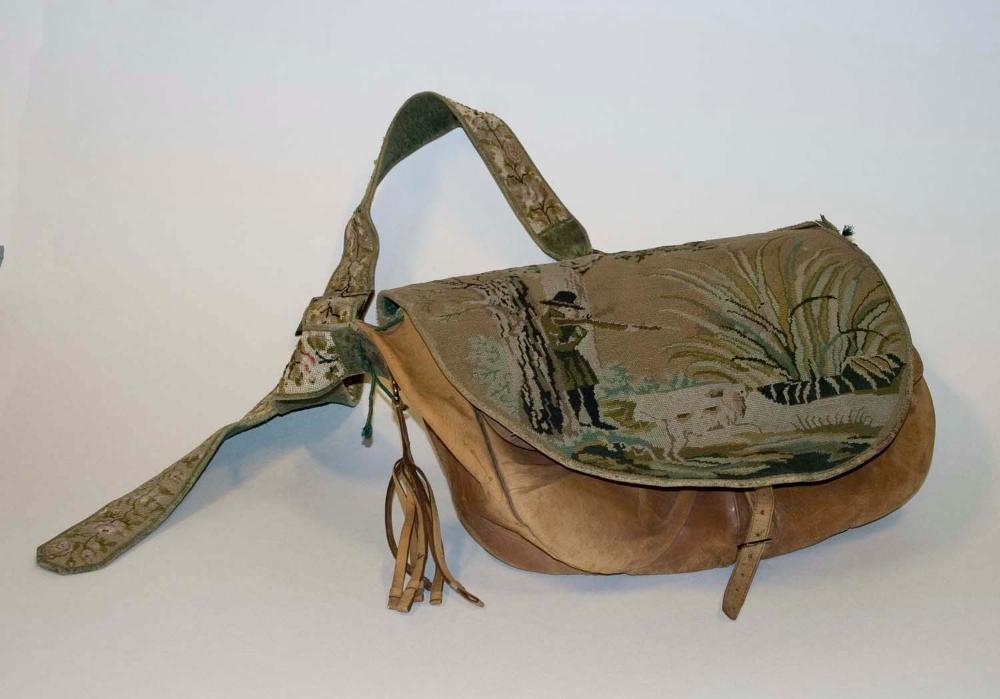Bestickte Jagdtasche, auf der Vordersteite Staffage mit Jäger und Hund in Seenlandschaft, auf der Rückseite ein Blumenkranz, von 2 Vögeln im Schnabel getragen.