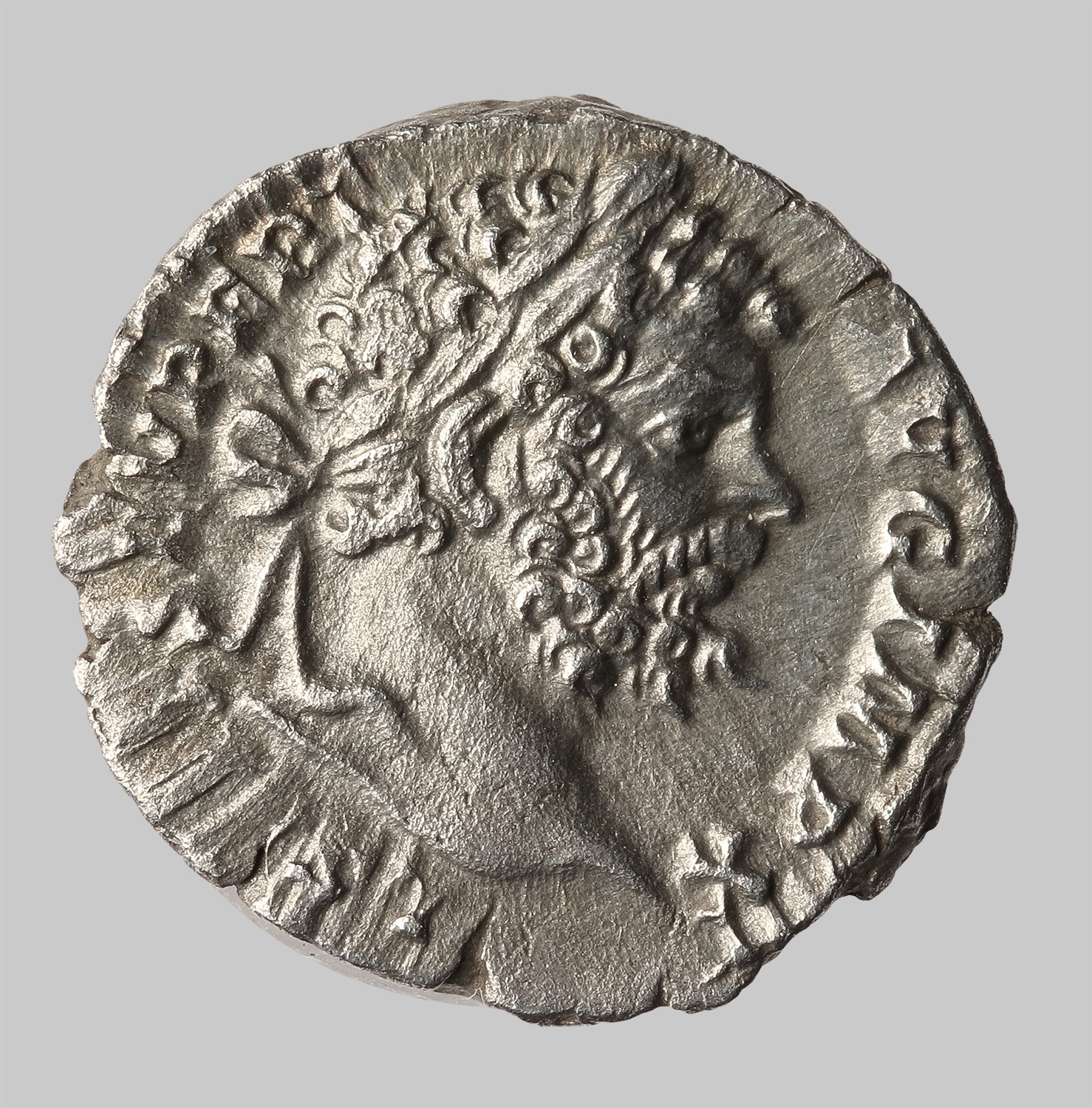 Kopf mit Lorbeerkranz nach rechts.