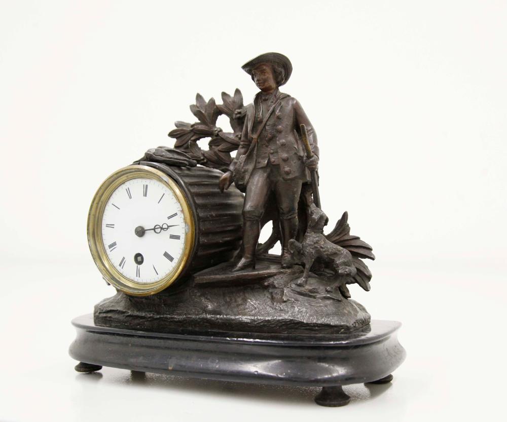Tischuhr französischer Provenienz mit der Darstellung eines Jägers mit Hund und erlegtem Wild in Landschaftsszene. Rundes Uhrwerk mit Federzug und Rollenhemmung. Emailzifferblatt mit römischen Ziffern, Stahlzeigern und Messinglunette.