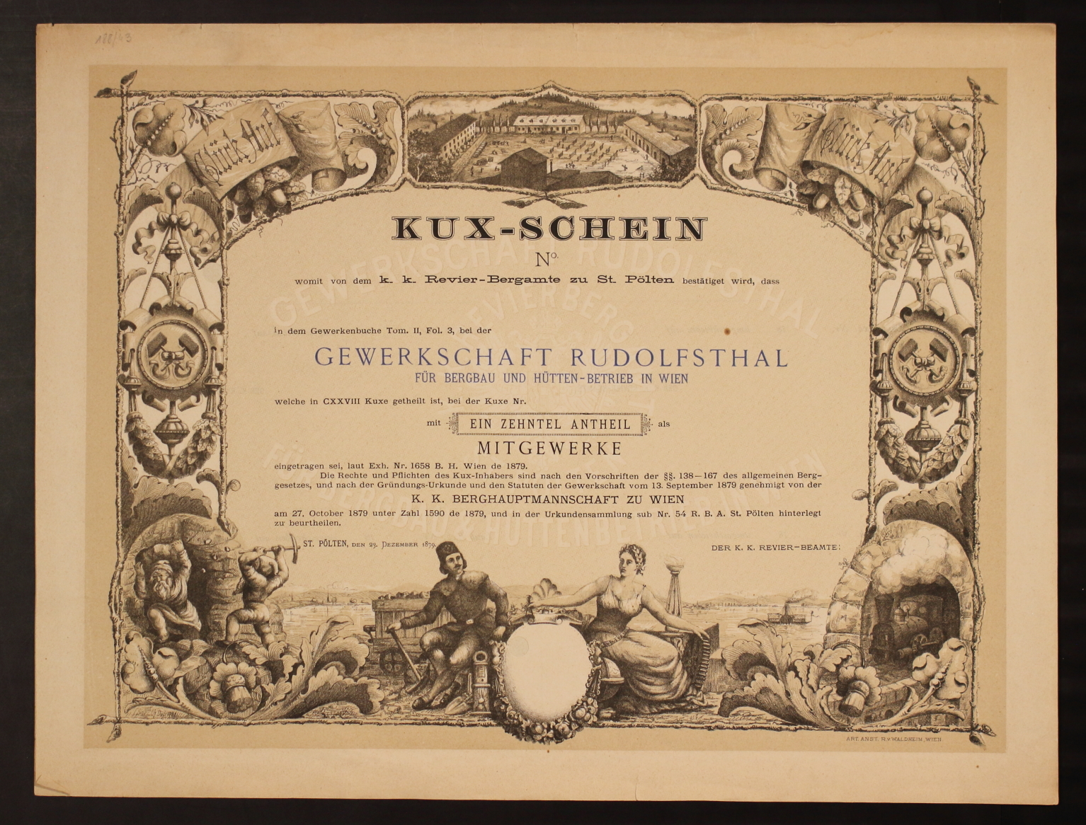 Kux-Schein, womit von dem k.k. Revier-Bergamte zu St. Pölten bestätiget wird, dass in dem Gewerkenbuche Tom. II, Fol. 3, bei der Gewerkschaft Rudolfsthal für Bergbau und Hütten-Betrieb in Wien, welche in CXXVIII Kuxe getheilt ist, bei der Kuxe Nr. [keine Nummer] mit ein Zehntel Antheil Mitgewerke eingetragen sei, laut Exh. Nr. 1658 B. H. Wien de 1879. Die Rechte und Pflichten des Kux-Inhabers sind nach den Vorschriften der §§ 138-167 des allgemeinen Berggesetzes, und nach der Gründungs-Urkunde und den Statuten der Gewerkschaft vom 13. September 1879 genehmigt von der k.k. Berghauptmannschaft zu Wien am 27. October 1879 unter Zahl 1590 de 1879, und in der Urkundensammlung sub Nr. 54 R.B.A. St. Pölten hinterlegt. St. Pölten, den 23. Dezember 1879. Der k.k. Revier-Beamte.“
