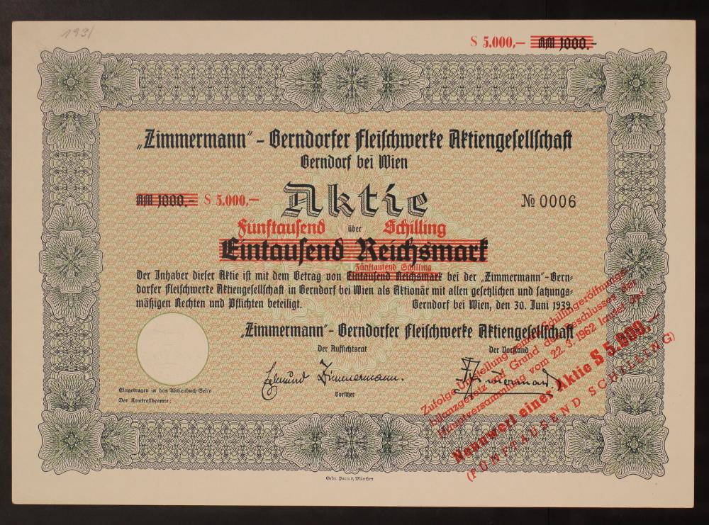 „Zimmermann“ - Berndorfer Fleischwerke Aktiengesellschaft Berndorf bei Wien. RM 1000.--[in rot dreimal durchgestrichen, daneben überdruckt mit S 5.000,-] No. 0006. Aktie über Eintausend Reichsmark [in rot dreimal durchgestrichen, daneben überdruckt mit Fünftausend Schilling]. Der Inhaber dieser Aktie ist mit dem Betrag von Eintausend Reichsmark [in rot dreimal durchgestrichen, daneben überdruckt mit Fünftausend Schilling] bei der „Zimmermann“ - Berndorfer Fleischwerke Aktiengesellschaft Berndorf bei Wien als Aktionär mit allen gesetzlichen und stzungsmäßigen Rechten und Pflichten beteiligt. Berndorf bei Wien, den 30, Juni 1939. „Zimmermann“ - Berndorfer Fleischwerke Aktiengesellschaft Berndorf bei Wien. Der Aufsichtsrat: Edmund Zimmermann, Vorsitzer. Der Vorstand: Zimmermann.