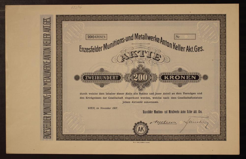 200 Kronen, Nr. [keine Nummer, lochentwertet]. Enzesfelder Munitions- und Metallwerke Anton Keller Akt. Ges. Aktie über 200 Kronen durch welche dem Inhaber dieser Aktie alle Rechte und jener Anteil an dem Vermögen und den Erträgnissen der Gesellschaft eingeräumt werden, welche nach dem Gesellschaftsstatute jedem Aktionär zukommen. Wien, im November 1907. Enzesfelder Munitions- und Metallwerke Anton Keller Akt. Ges.: Anton Keller, Fleischer.