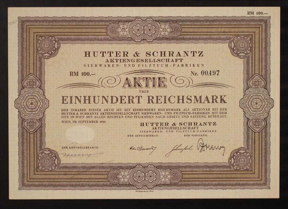 Hutter & Schrantz Aktiengesellschaft Siebwaren und Filztuch-Fabriken, 100 Reichsmark