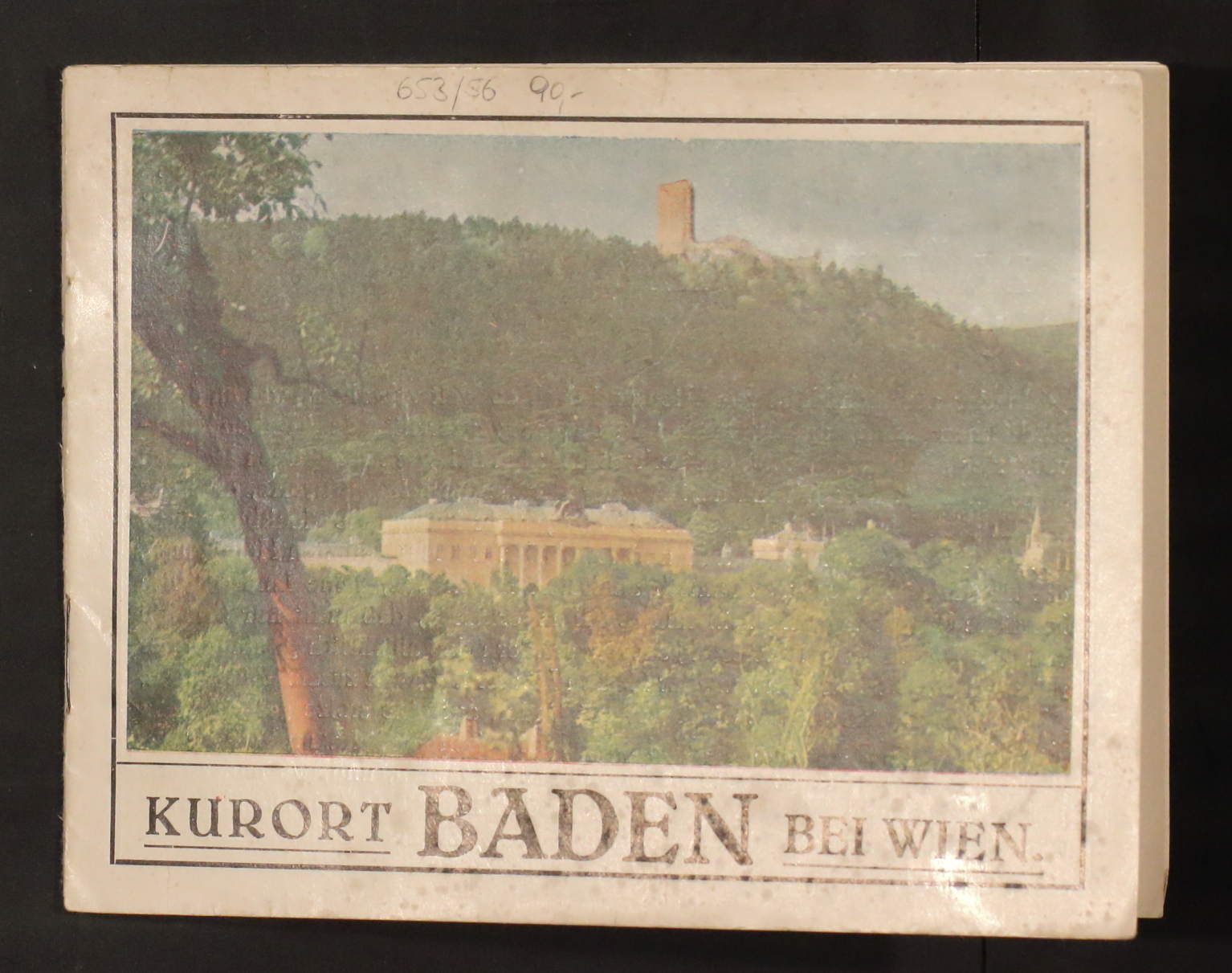 Österreichisches Verkehrsbureau und Österreichische Verkehrswerbungs-GmbH; Werbeprospekt vom Kurort Baden bei Wien, mit Geschichte, Beschreibung und Abb. vom Helenental, städt. Bade- und Kuranstalt, Badehotel „Herzoghof“, Franzensbad, sowie Verzeichnis der Hoteliers, Sanatorium und Pensionen, am Umschlag Farbfotos, erstmals angeboten, 12 Seiten.