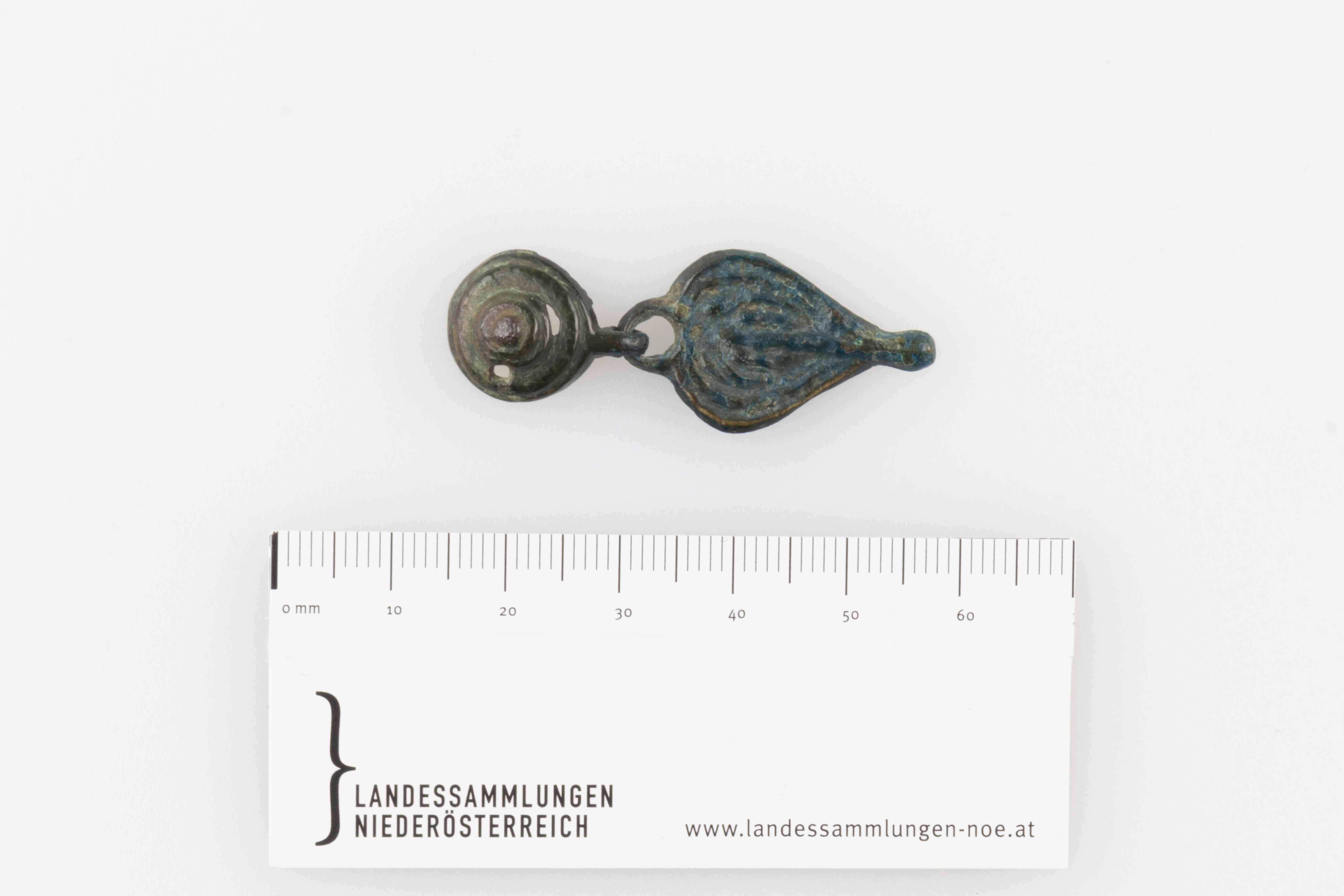 Herzförmiger Anhänger, bestehend aus zwei Teilen: einer kugelsegmentförmigen Scheibe und einem Unterteil in Herzform. Die Oberseite der Scheibe ist profiliert mit stark hervortretendem Zentrum. An der Unterseite zwei Ösen zum Befestigen auf einer organischen Unterlage, eine dritte zum Einhängen des Anhängers. Die Rückseite der Anhänger ist flach, die Oberseite mit einem an die Umrisslinien angepassten Muster versehen. Teilweise blaue Patina.
