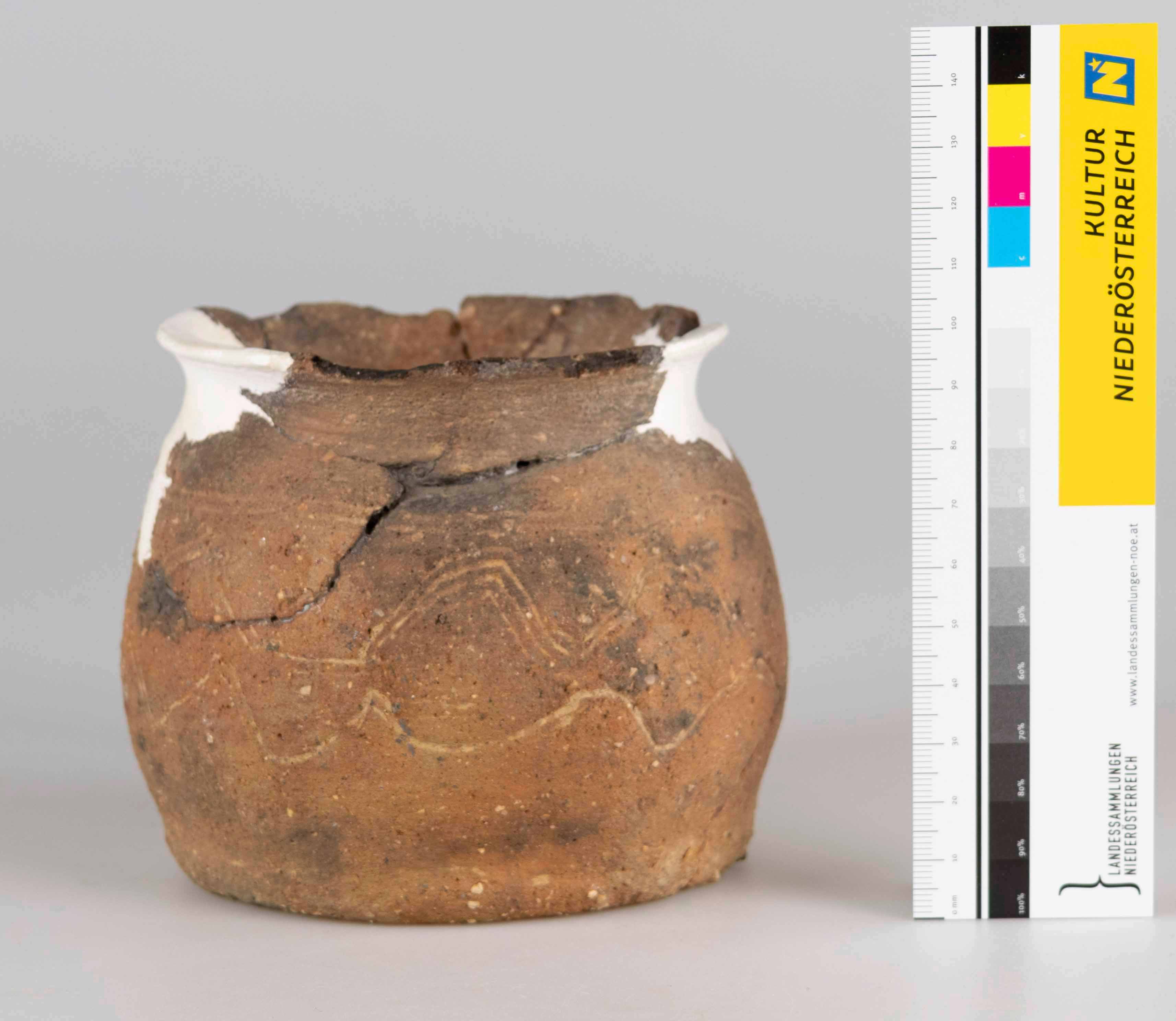Töpfchen aus reichlich quarzsteinchengemagertem, hart gebrannten Ton. Rötlichbraune bis graue, spärlich geglättete Oberfläche. Deutlich abgesetzte Standfläche, bauchig gedrungener Körper, gut von der Schulter abgesetzter, kehlig profilierter Hals, ausladender, gerader Rand. Doppelrille an der Schulter; auf dem Bauch ein doppeltes und ein einfaches, unregelmäßiges Wellenband.
