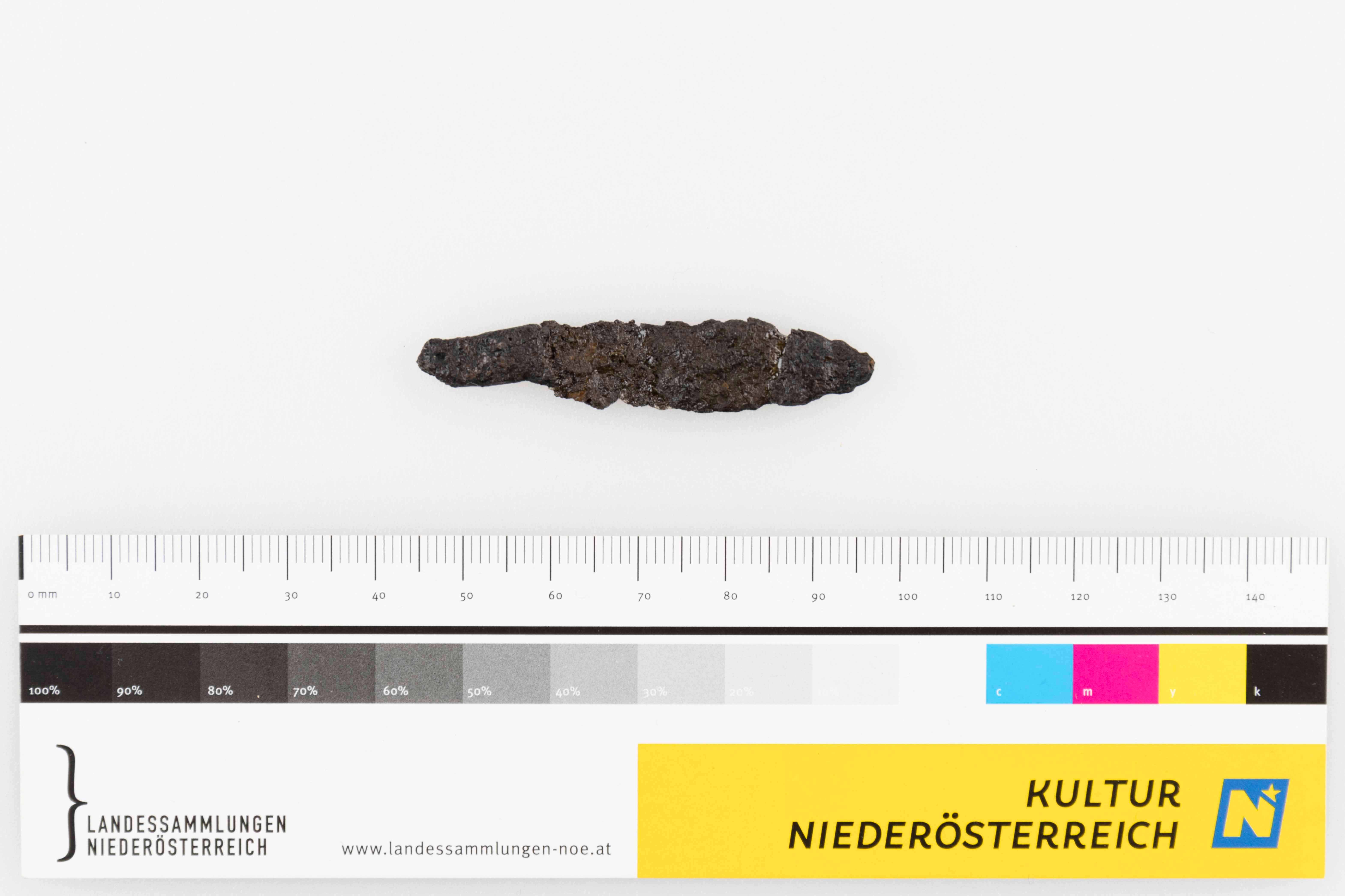Kleines Griffangelmesser, Eisen, gerundeter Messerrücken und Schneide, Spitze fehlt.