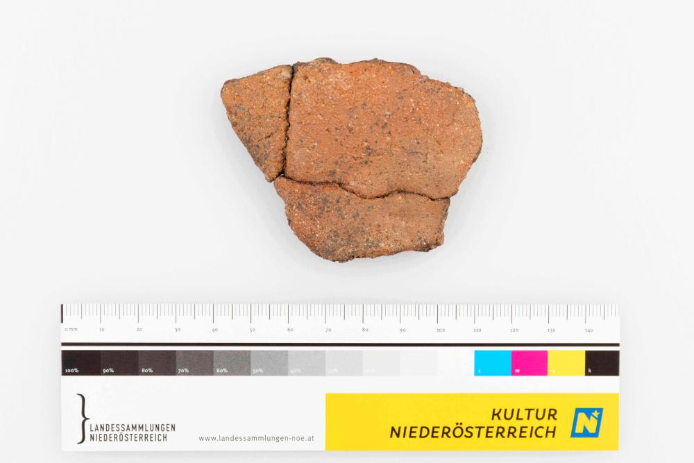 An der Kante zum Boden abgebrochenes Wandbruchstück eines Gefäßes aus quarzsteinchengemagertem, glimmerhältigem, sehr hart gebranntem Ton. Orange-braun bis graue, spärlich geglättete Oberfläche, konisch aufgehende, leicht eingezogene Wand.