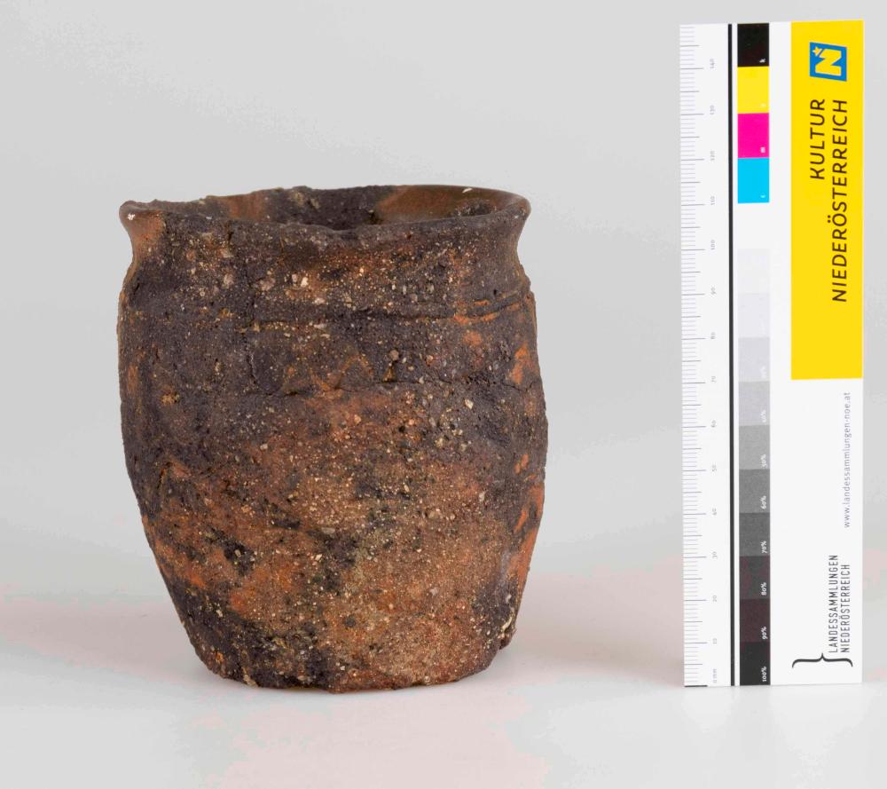 Töpfchen aus quarzsteinchengemagertem, rotbraun bis dunkelgraubraun und hart gebranntem Ton. Ebene Standfläche, fässchenförmiger Körper, leicht ausladender, unregelmäßiger Rand. Unterhalb des Halses zwei rundum laufende Rillen, am Körper zwei undeutlich erkennbare, mehrzeilige, unregelmäßige Wellenbänder, darunter ein zweizeiliges Linienband.