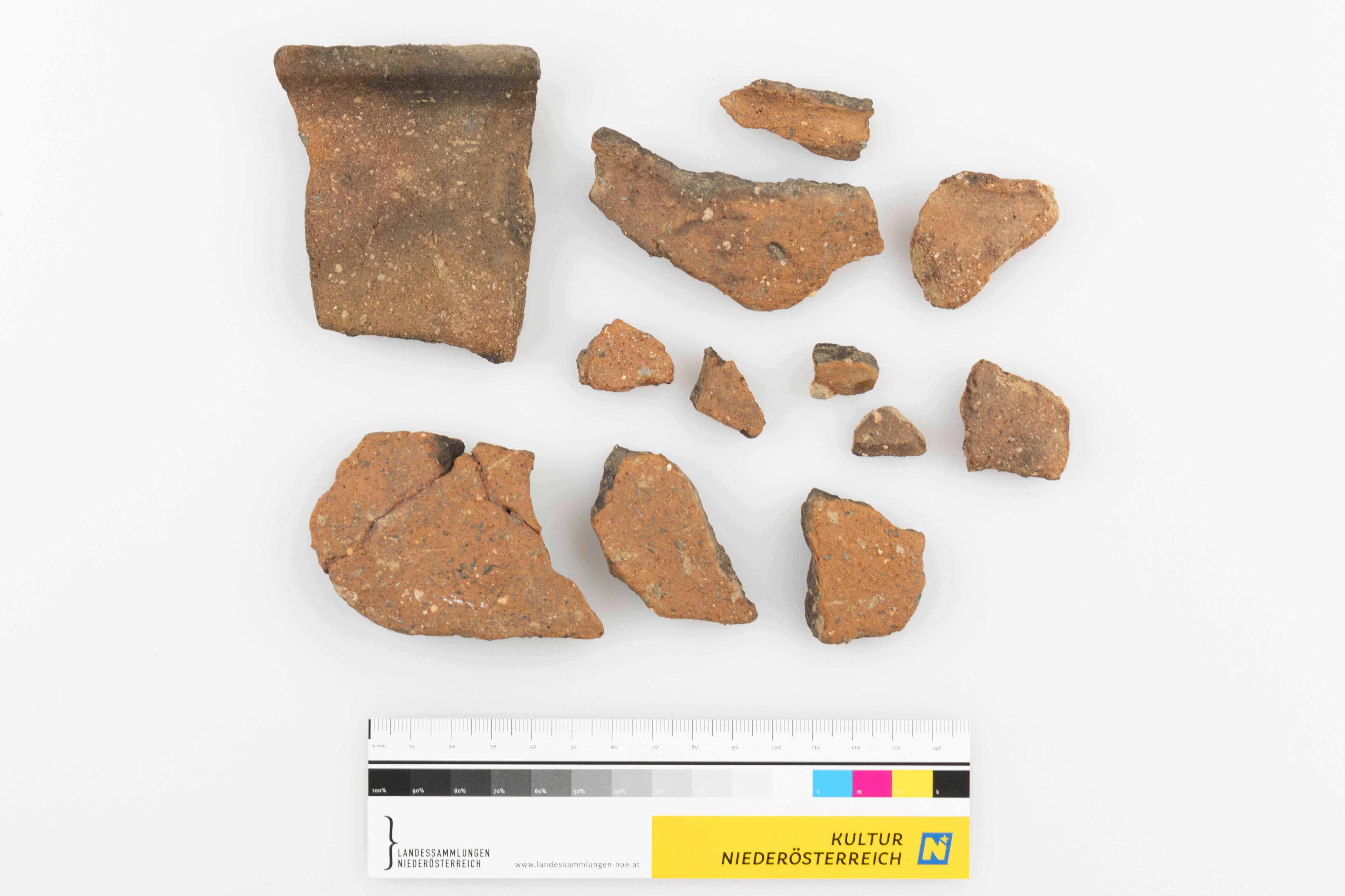 Bruchstücke eines Topfes aus gut gebranntem, quarzsteinchengemagertem, glimmerhältigem Ton. Oberfläche rötlich bis graubraun, bauchiger Körper, kehlig profilierter Hals, ausladender, etwas schräg nach außen abgestrichener Rand.