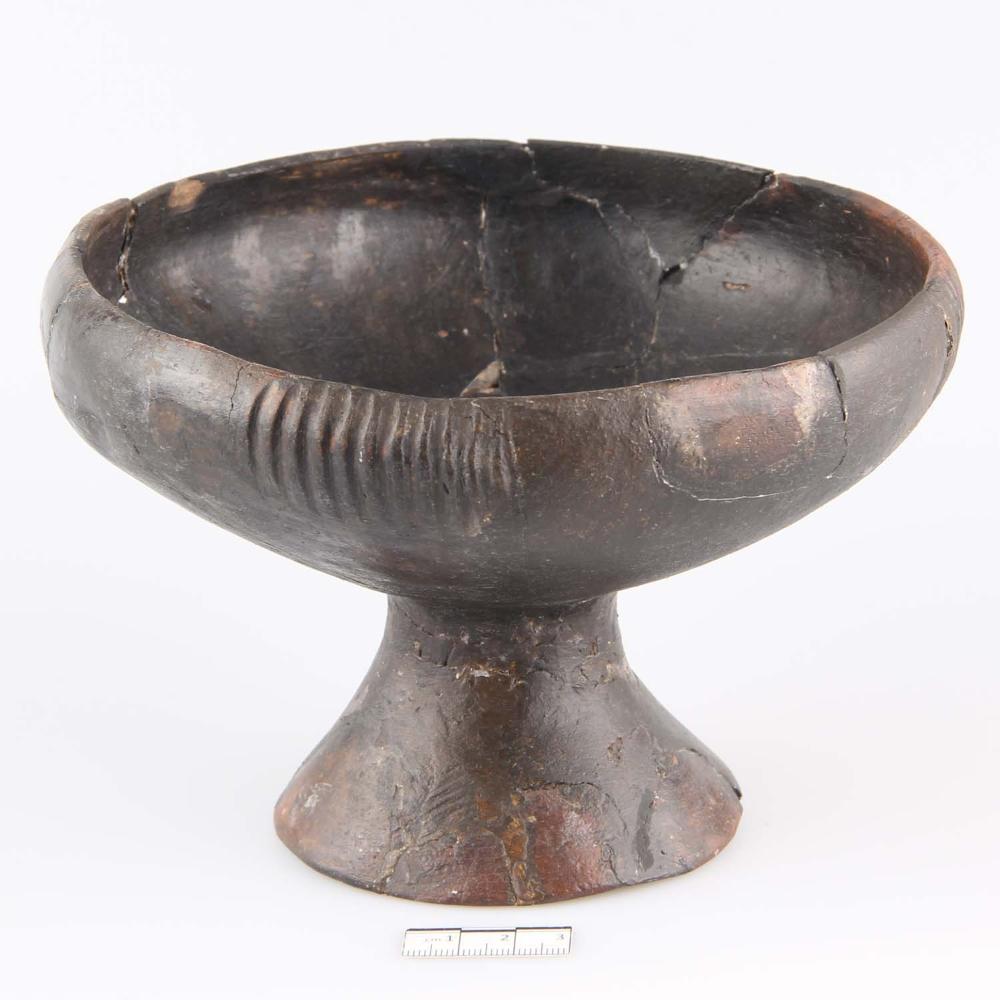 Scherbenbeschaffenheit: im Bruch Farbe unbestimmbar, dicht fein und mittelgrob steinchengemagert, mäßig hart gebrannt. Außenoberfläche: dunkelbraun, schwarzgefleckt, geglättet. Innenoberfläche: schwarz, geglättet. Form; Standfuß, knisch, flachkinischer Unterteil, gewölbter Umbruch, nach inen geneigter kurzer Oberteil. Verzierung: Mundsaum: -. Schulter/Bauch: 4 4,1–4,8 cm breite Gruppen von 9–11 senkrechten, 0,3 cm breiten Riefen, kreuzständig angebracht.