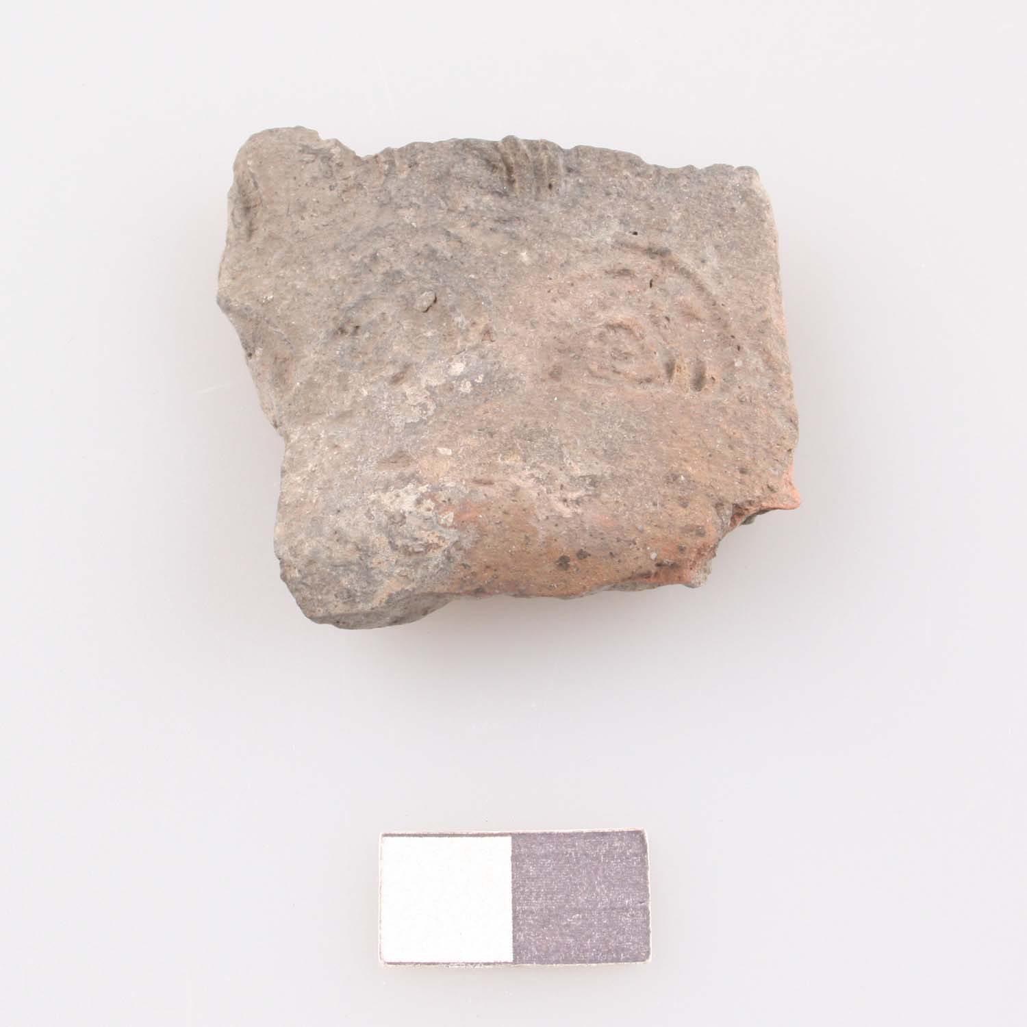 Wandstück eines freihändig geformten Gefäßes, germanisch, verziert mit viertelkreisförmigen Schwungbogenköpfen