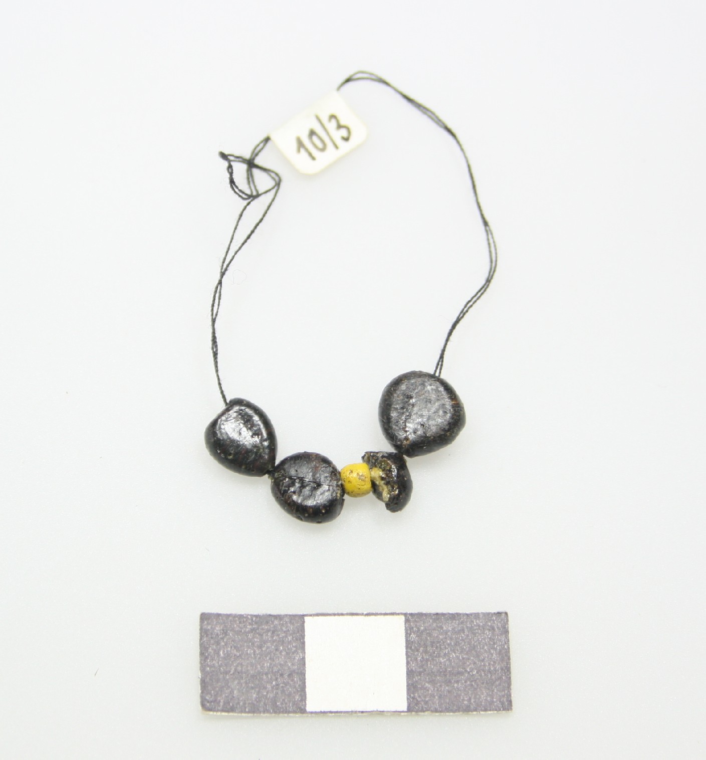 einem Fragment einer gedrungenen, schwarzen Melonenkernperle