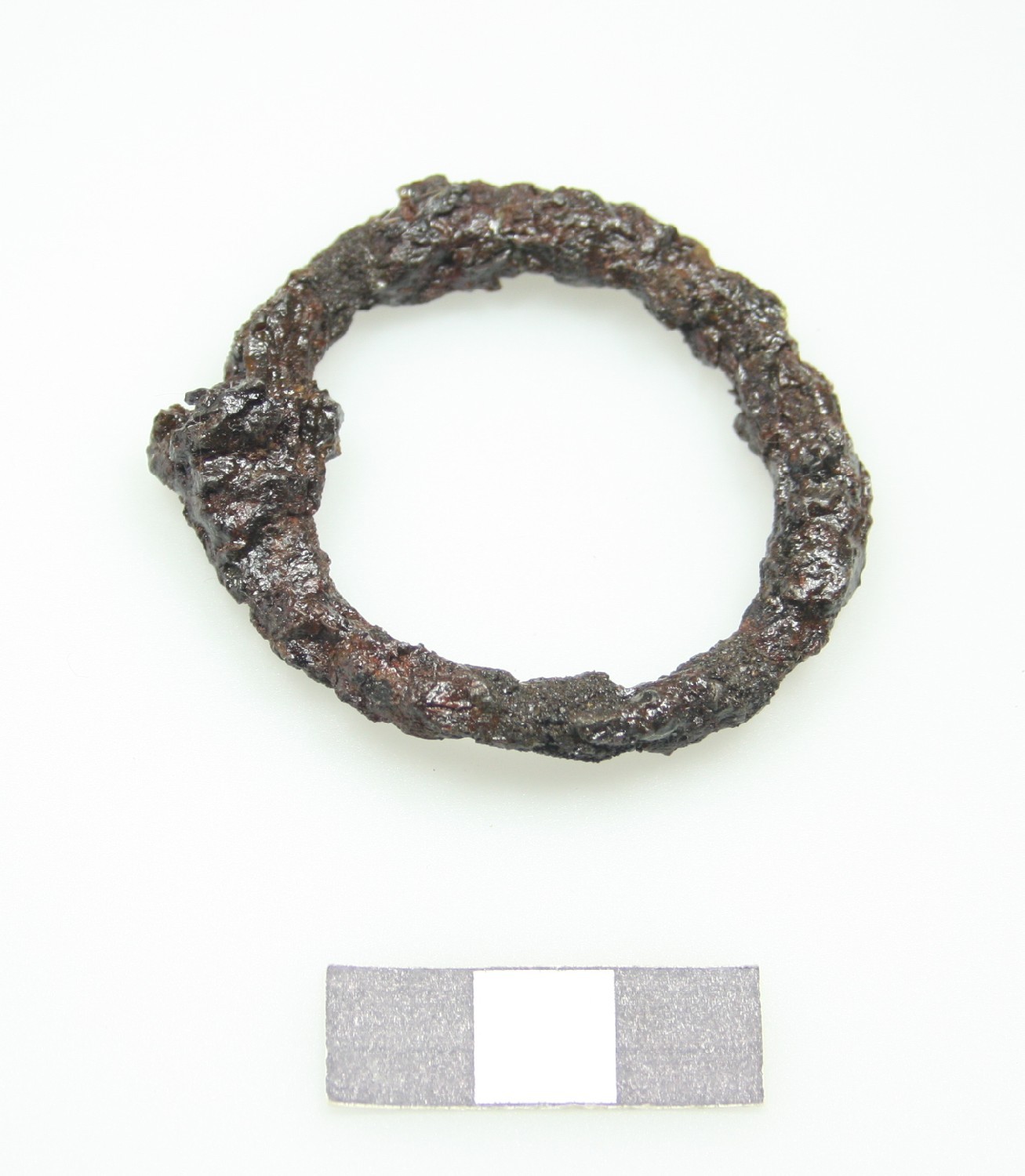 Gut erhaltener Eisenring mit Verdickung, ankorrodiertes Kettenglied? Runde Schnalle?
