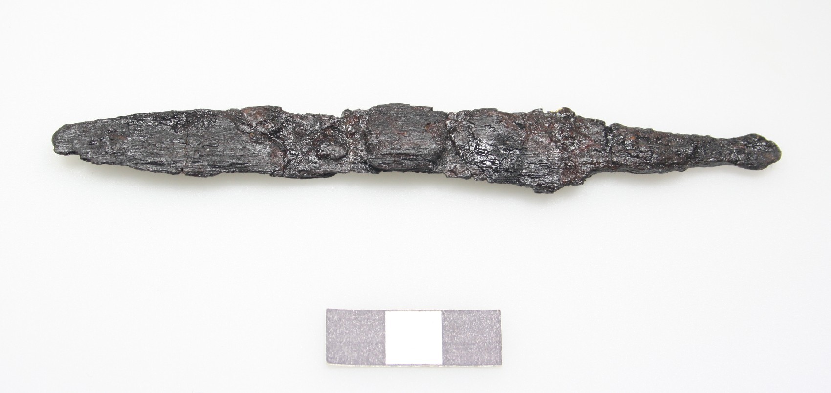 Eisernes Griffangelmesser mit anhaftenden Holzresten der Scheide