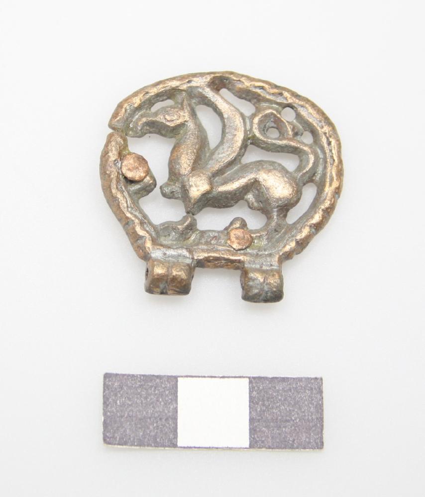 Annähernd runder Greifenbeschlag mit Scharnier, ohne Anhänger. Buntmetallguss, Schauseite verzinnt. L 3,4, B 3,4, D Beschlagmitte 0,3 cm, Gewicht 12,2 g