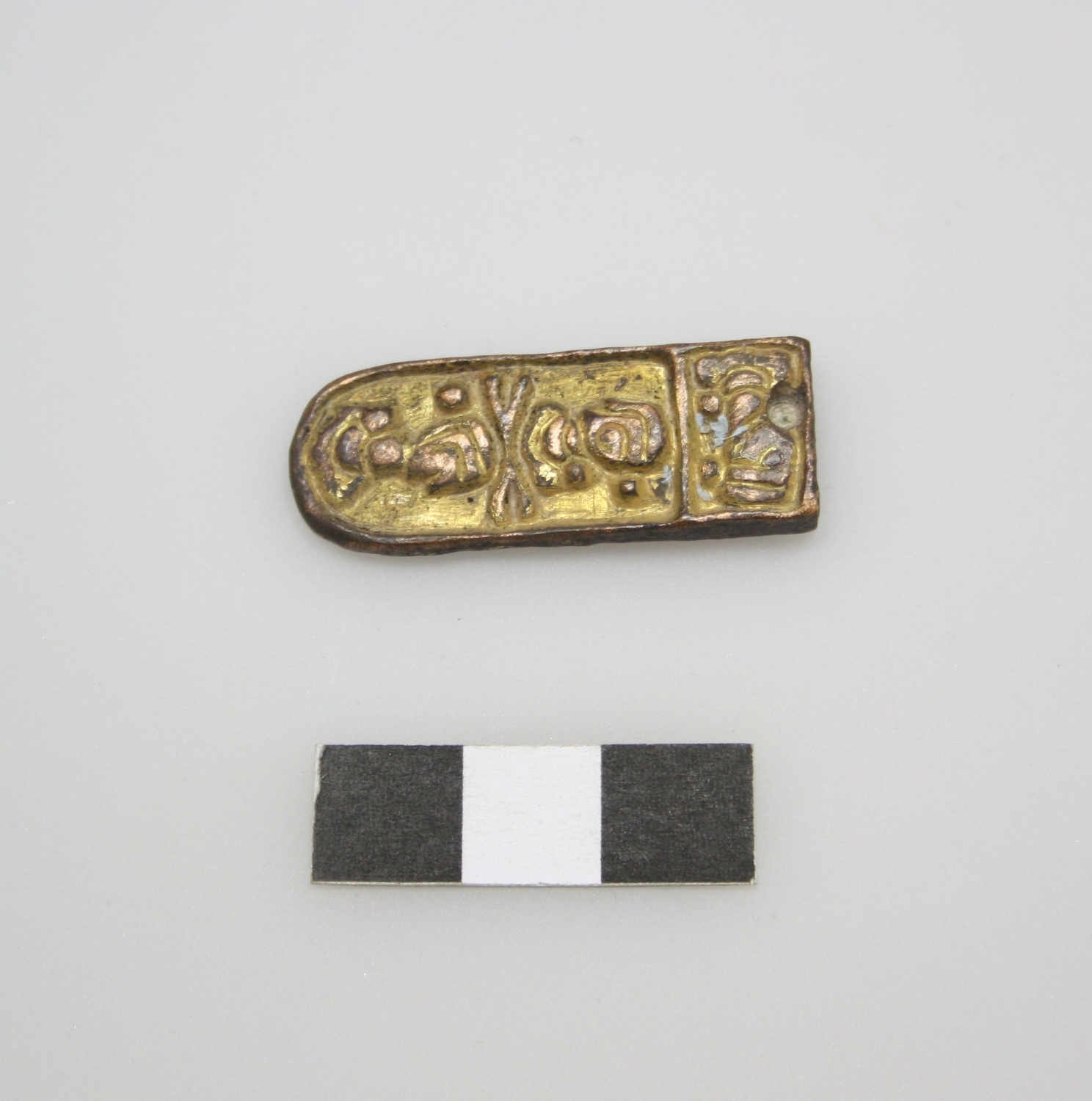 Nebenriemenzunge, gegossen und vergoldet, zwei im Profil dargestellte Köpfe im Hauptfeld der Vorderseite, ein quergestellter, gleichartiger Kopf im Nebenfeld an der Zwinge. Auf der Hinterseite S-Ranke. L 3,7, B 1,4, D 0,5 cm, Gewicht 8,2-9 g, zusammen 34 g