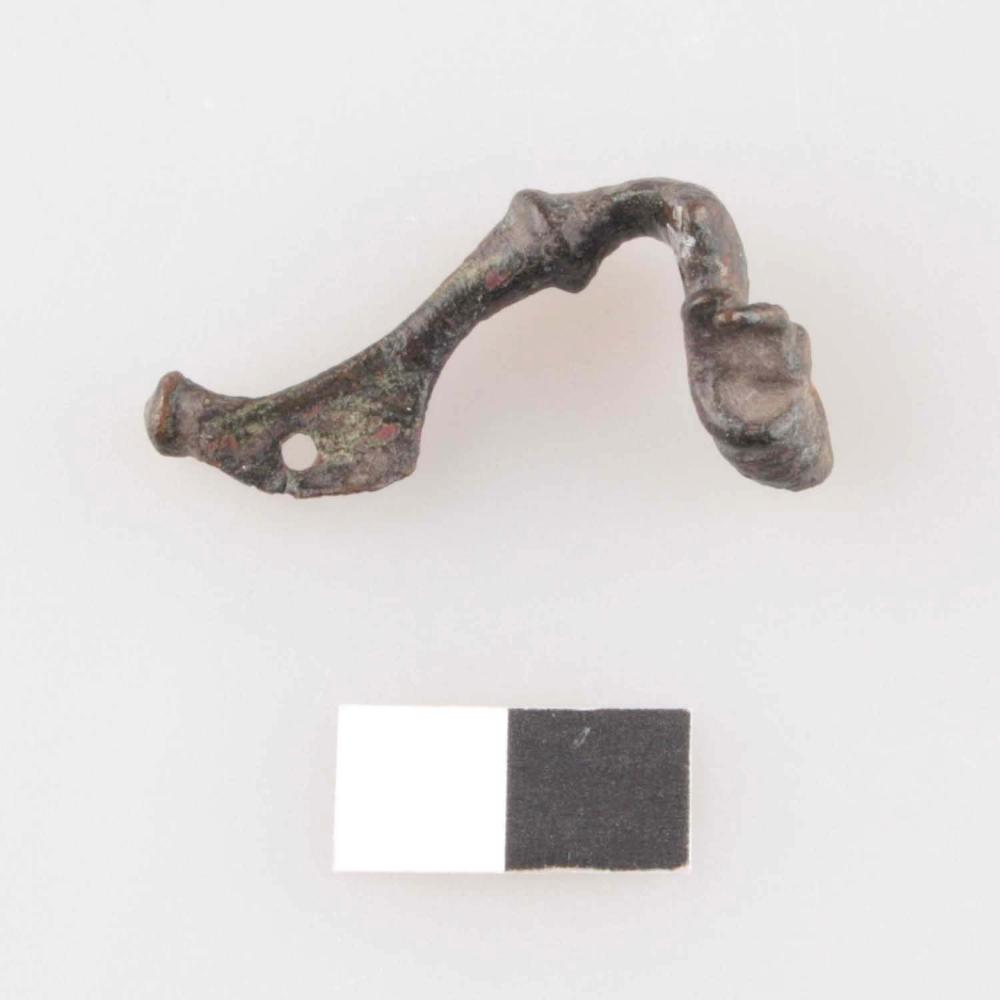 Kräftig profilierte Fibel (A68) mit Stützplatte, durchlochtem Nadelhalter und Fußknopf, ein Teil der Spirale und Nadel fehlen (Jobst Var B).