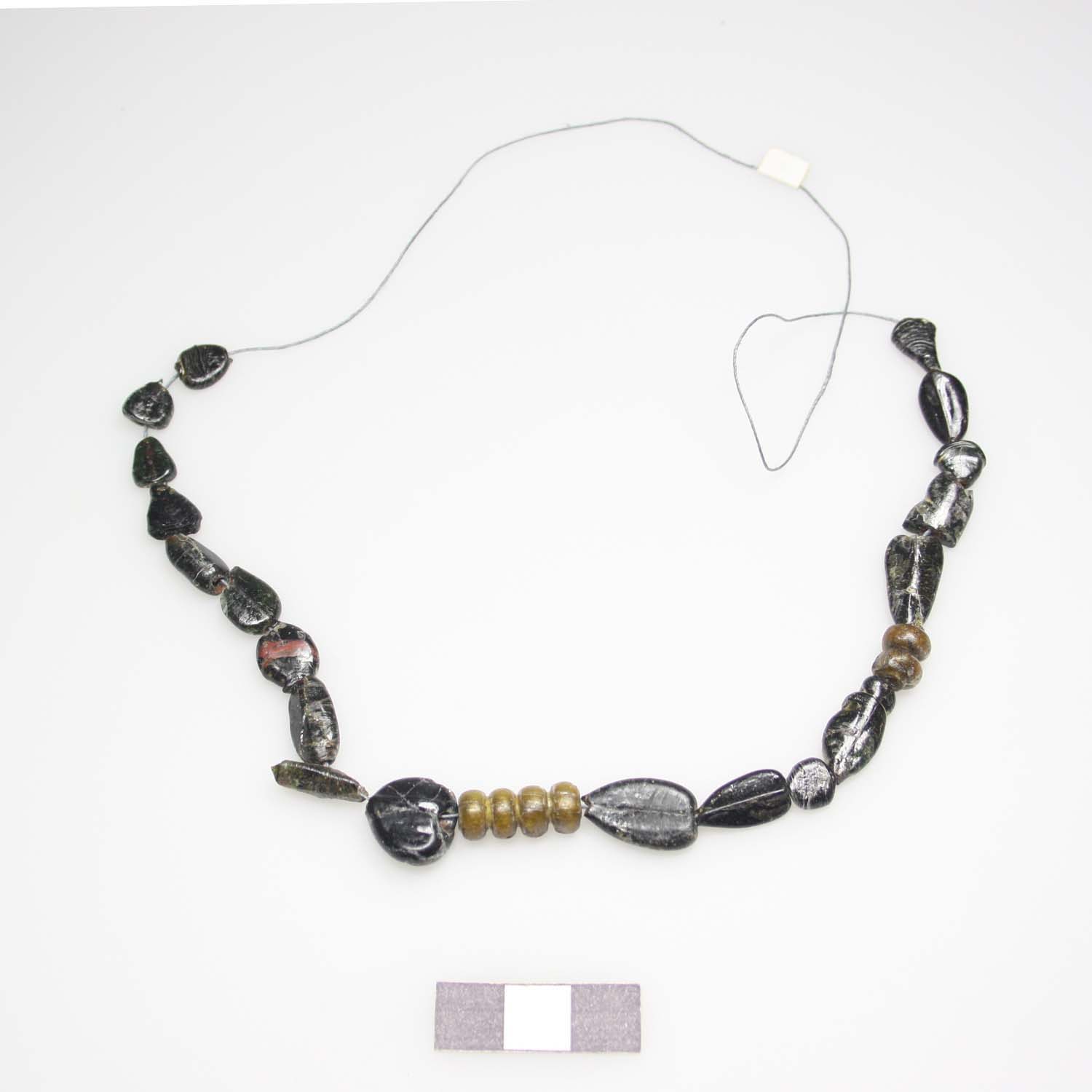 Perlenkette bestehend aus 19 verschieden großen, schwarzen Melonenkernperlen sowie zwei gelbbraunen Stangenperlen. Daneben zwei Fragmente von schwarzen Melonenkernperlen (Eines verschollen)