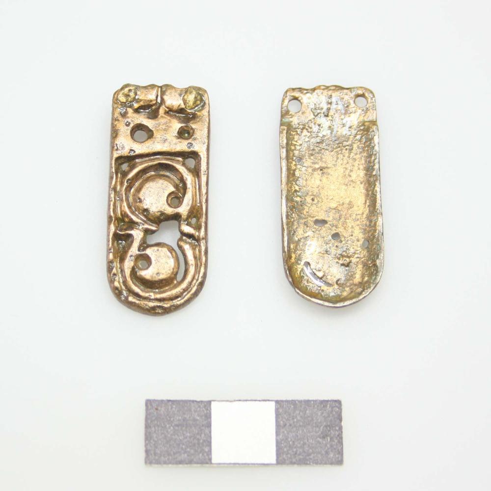 Nebenriemenzunge, Buntmetallguss, zweiteilig, mit Zwinge aus zwei gegenständigen Tierköpfen und "flacher Kreislappenzier". An der Innenseite beider Gußhälften deutlich erkennbare Gewebestruktur