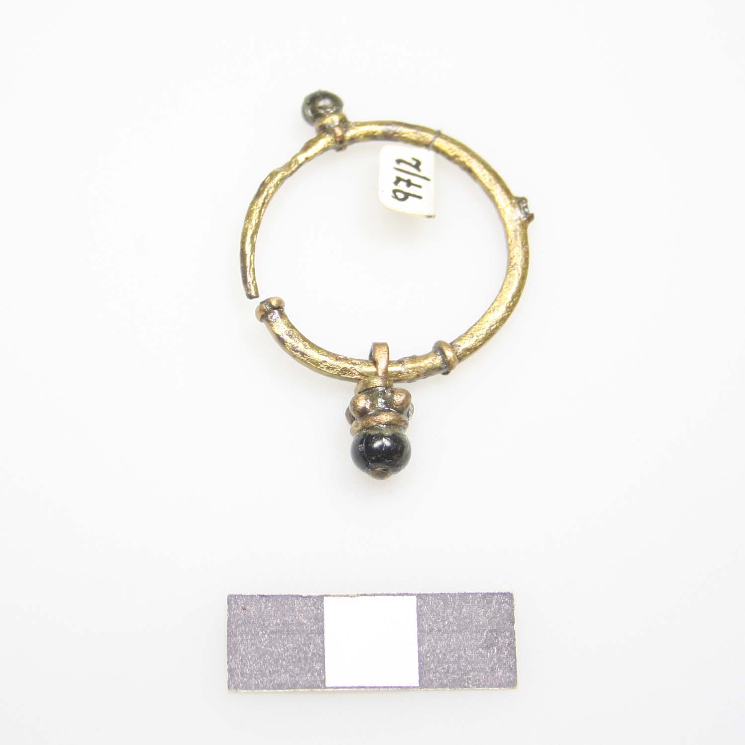 Großer, offener Kopfschmuckring aus stellenweise kantigem Buntmetalldraht, am Ende ein Buntmetallringlein aufgeschlauft. Unten gegenständig eine größere, schwarze Glasperle an einer Buntmetallhülse, die zwischen zwei Buntmetalldrahtringen sitzt, und eine kleine, schwarze Perle. Zwischen dieser und dem Kopfschmuckring ein Buntmetalldrahtring. Oben gegenständig zwei zwei schwarze Glasperlen, davon die äußere fragmentiert. Am Kopfschmuckring überdies ursprünglich vier Buntmetallkügelchen aufgelötet, davon eines fehlend.
