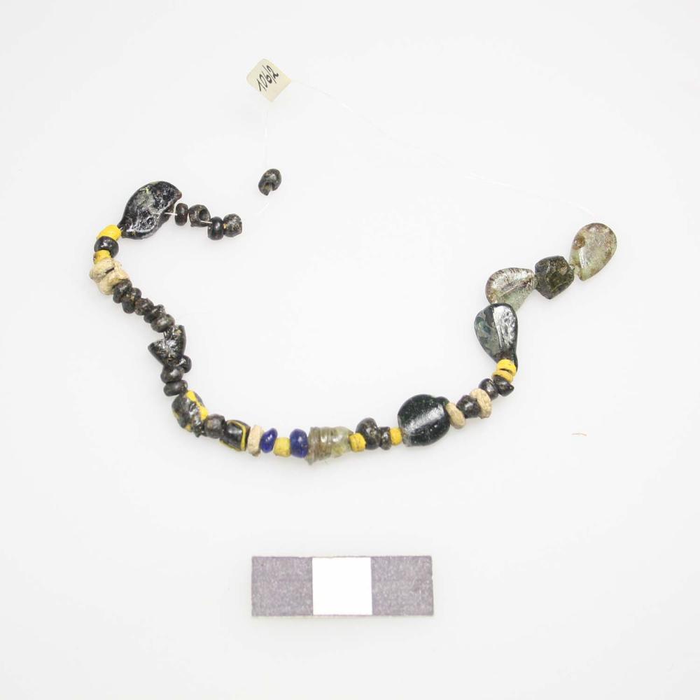 Perlenkette, bestehend aus 5 schwarzen und drei farblosen Melonenkernperlen, zwei schwarzen Perlen mit gelber Fadenauflage, 20 schwarzen und 7 gelben Hirsekornperlen, drei kleinen, ringförmigen, blauen Glasperlen sowie 5 stark korrodierten Bleiperlen (?)