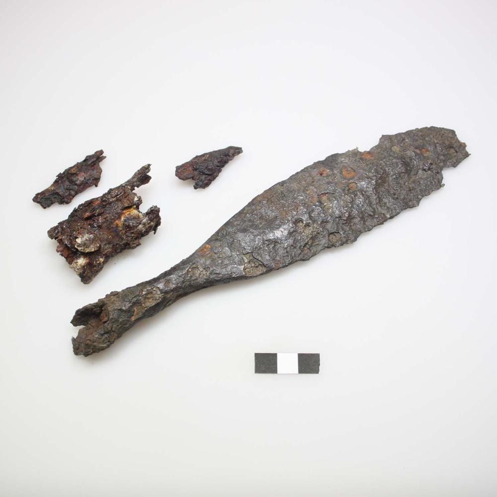 Eiserne Lanzenspitze mit Tülle, darin Reste des Schaftes ankorrodiert. Tülle abgebrochen, aber in mehreren Fragmenten erhalten; Spitze abgebrochen.