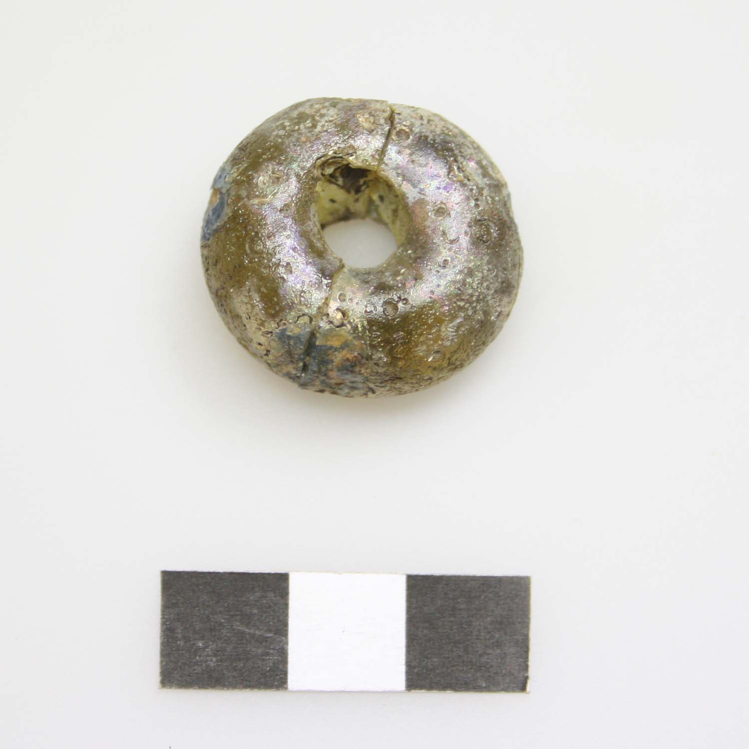 Gequetscht-kugelige, grünbraune Glasperle