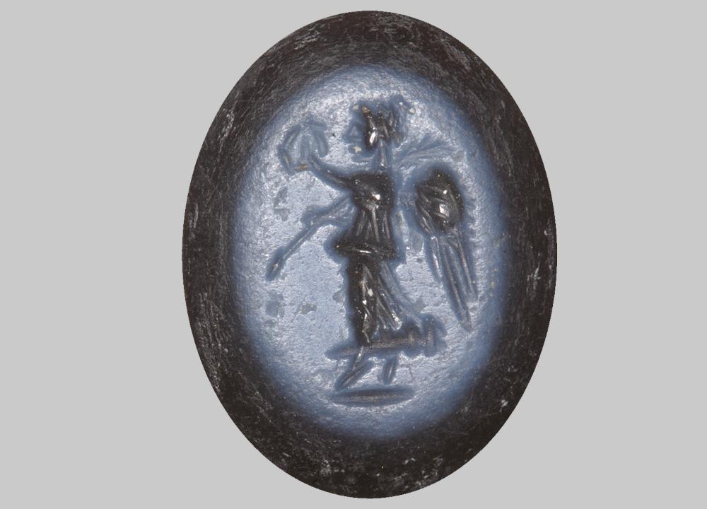 Victoria, bekleidet mit einem gegürteten Chiton mit Überschlag, geflügelt, auf den Zehenspitzen nach links schreitend, hält in der ausgestreckten Linken einen Kranz und trägt über der rechten Schulter einen Palmzweig.