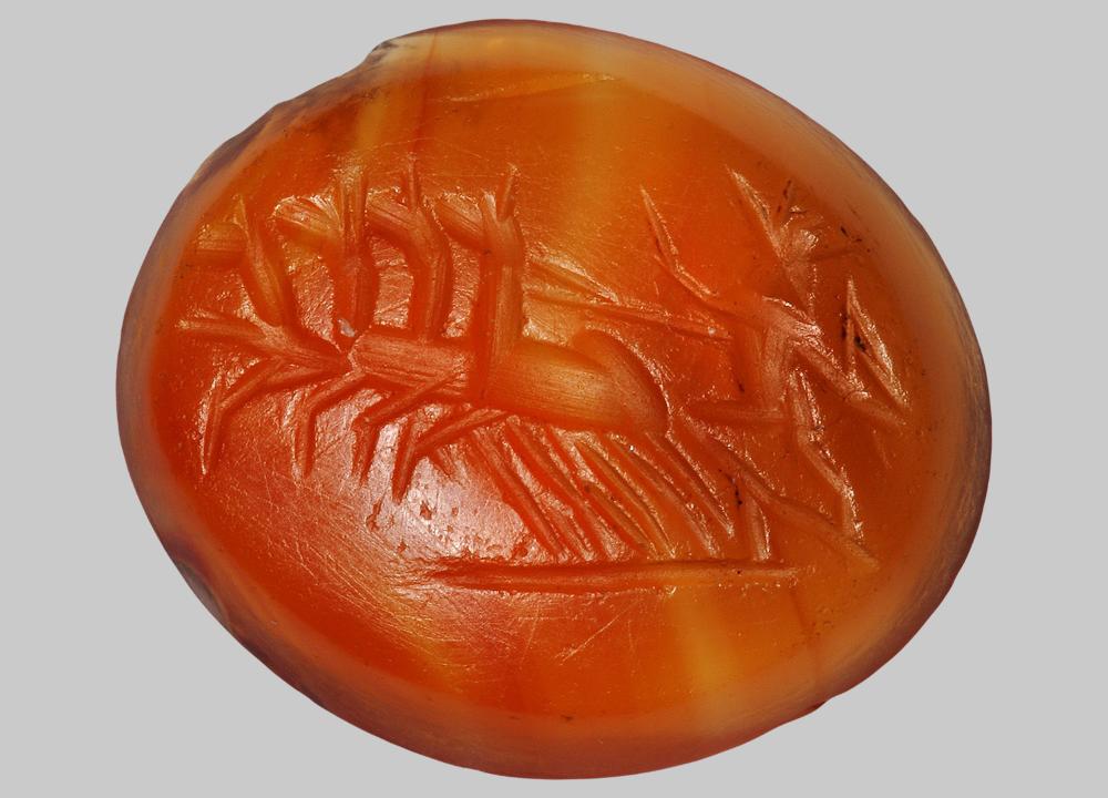 Sol, nackt bis auf das Mäntelchen über seiner rechten Schulter, steht in einem von vier Pferden nach links oben gezogenen Wagen. Er hat die Linke erhoben, mit der Rechten hält er die Zügel und die eingelegte Peitsche.