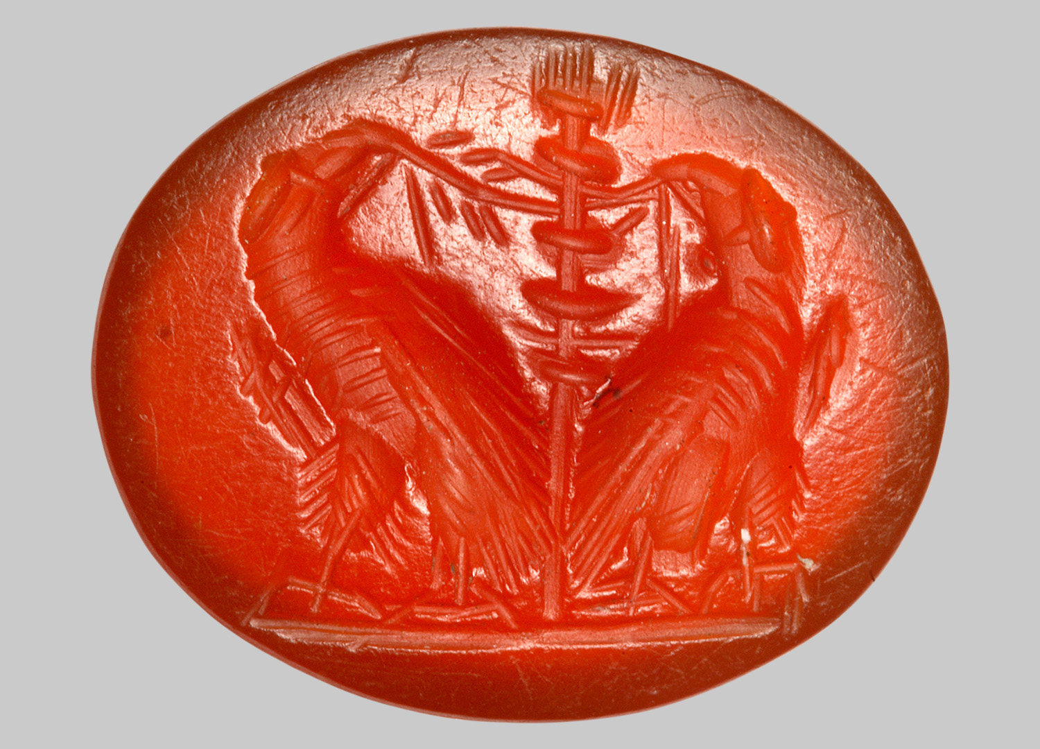Zwei Adler, jeweils in Dreiviertelvorderansicht nach außen stehend, wenden einander den Rücken zu und die Köpfe zur Mitte. Sie halten in den Schnäbeln je einen Zweig mit dem sie ein in der Mitte stehendes Feldzeichen bekränzen. Grundlinie.