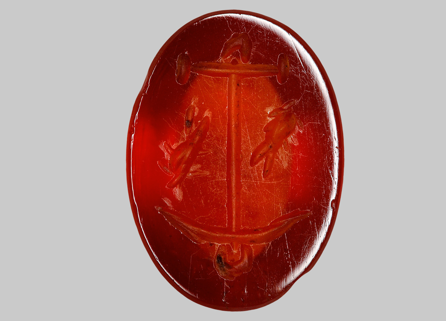 In der Bildmitte ein großer Anker. Rechts ein nach oben, links ein nach unten gerichteter Fisch.