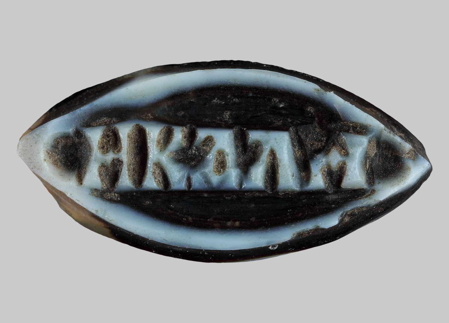 Der spitzovale kleine Kameo trägt eine gerahmte griechische Inschrift, die übersetzt "die Schöne" (ergänze: "besitzt dieses Schmuckstück") bedeutet. Der Text ist nicht, wie man gemeint hat, als magische Beschwörung zu verstehen, sondern verbeugt sich nur vor der Schönheit einer Frau, der dieser Kameo wohl geschenkt wurde.