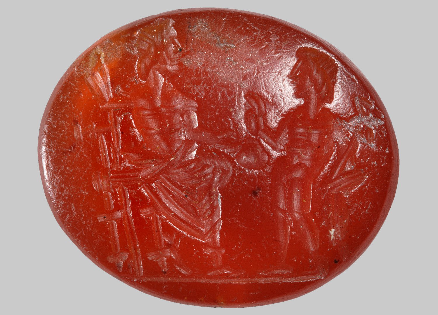 Jupiter nach rechts auf Thron sitzend, stützt sich mit der Rechten auf ein langes, bis zum Boden reichendes Szepter und hält in der Linken eine Patera. Vor ihm steht, kleiner an Gestalt als der Sitzende, Merkur, nackt bis auf das Mäntelchen um seinen linken Unterarm, in Dreiviertelvorderansicht nach links. Er hält in der Linken den Caduceus und reicht mit der Rechten Jupiter einen Geldbeutel entgegen. Grundlinie.