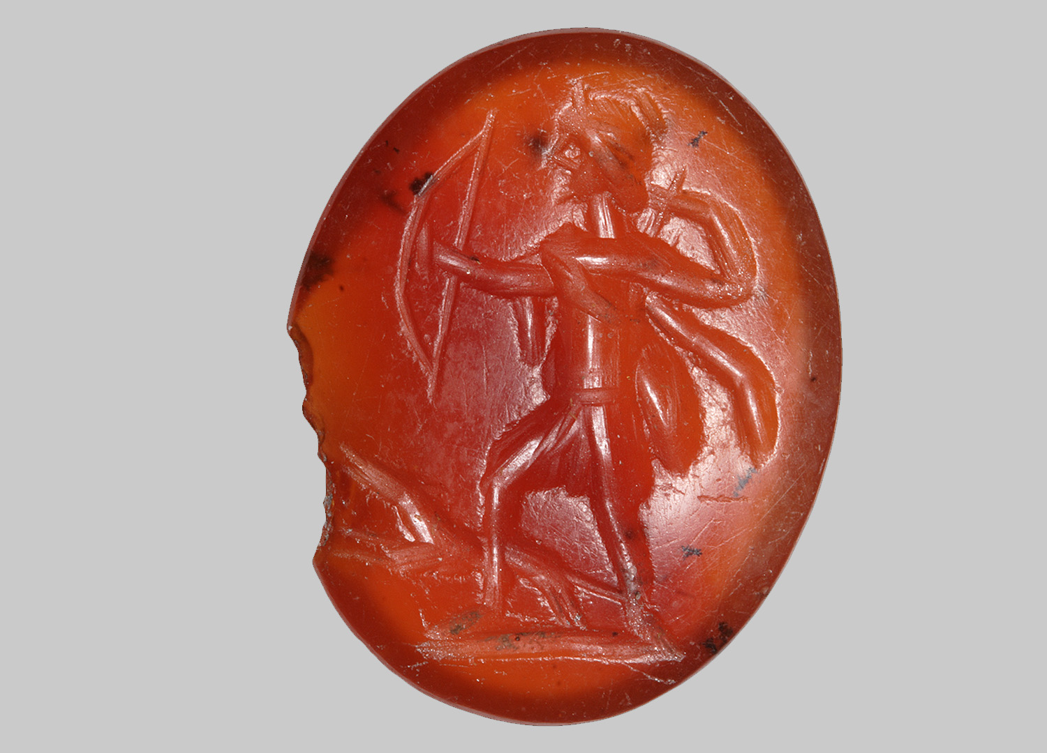 Diana, bekleidet mit einem kurzen Chiton, das Haar im Nacken zu einem Knoten gebunden, in Schrittstellung nach links, hält mit der Rechten einen Bogen und holt mit der Linken aus dem auf ihrem Rücken befestigten Köcher einen Pfeil heraus. Links zu ihren Füßen ein nach links springender Hund. Grundlinie.