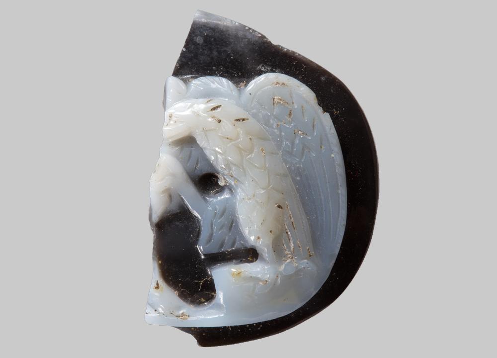 Adler in Dreiviertelvorderansicht nach links stehend, greift offenbar mit dem rechten Fang an seinen Schnabel. Aufgrund der Steinbeschädigung bleibt die Darstellung unvollständig.