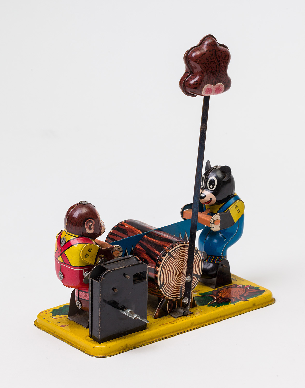 2 Affen, einen Baumstamm sägend, mit Uhrwerksantrieb, Fa. Yone, Made in Japan