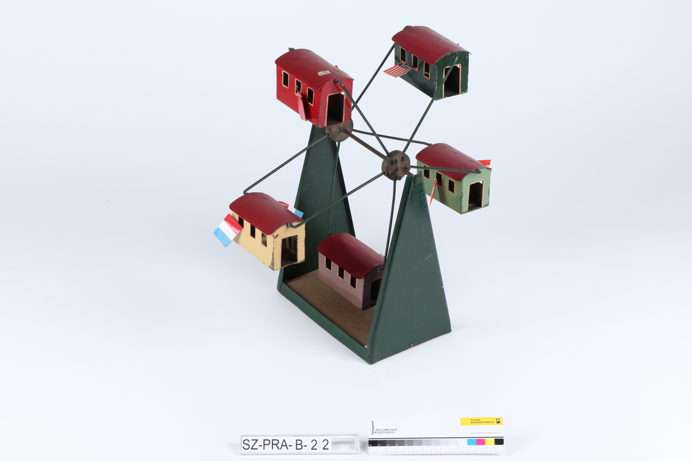 Riesenrad aus Blech mit 5 Kabinen (auf denen je eine andere nationale Flagge angebracht ist), händisch zu bedienen