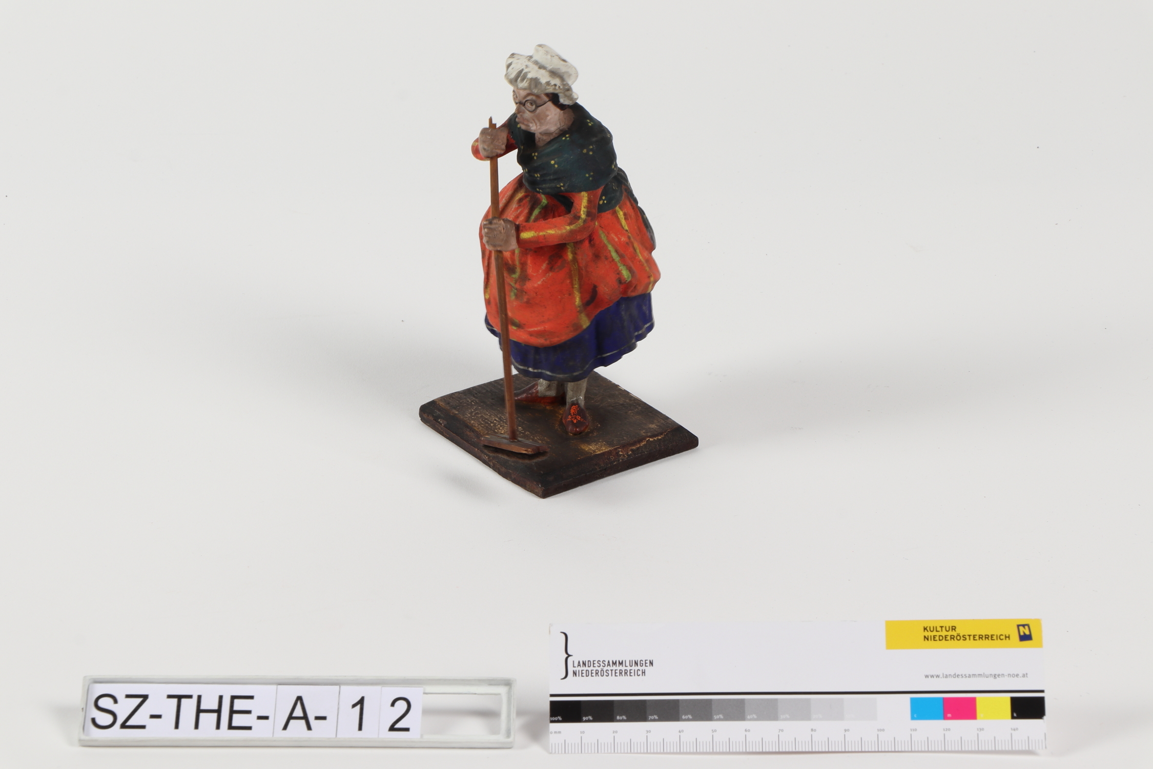 Theaterfigur aus Holz, dieses bemalt, der Oberkörper bewegt sich (in der Art eines Wackelkopfes) in und her, Österreich-Ungarn 1890.