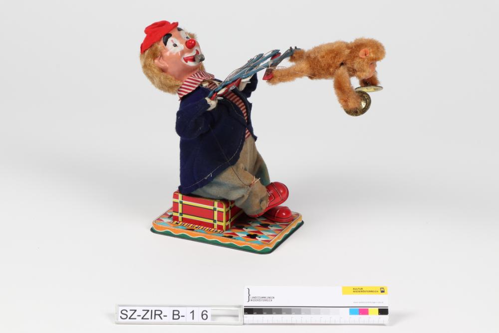 Clown mit mechanischem Antrieb, einen musizierenen Affen werfend