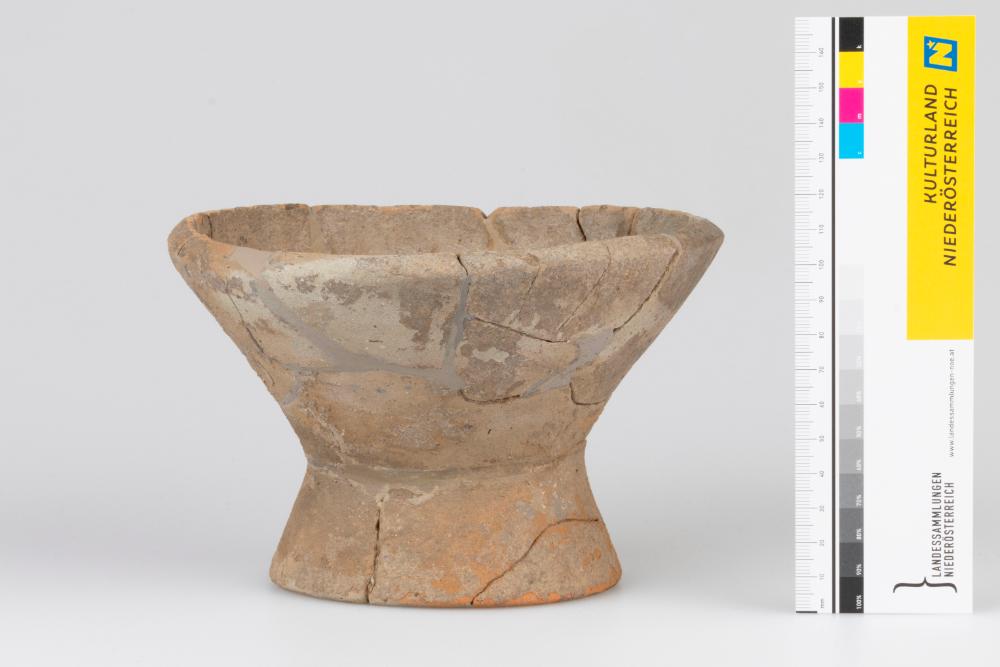 Die Fußschüssel weist einen konisch geformten Gefäßkörper und einen ebenfalls konischen Fuß auf. Der Rand ist zur Gefäßinnenseite hin leicht verbreitert, der Mundsaum ist flach ausgearbeitet und fällt schräg nach außen ab. Das Gefäß ist oxidierend weich gebrannt, fein gemagert und zeigt eine leicht raue Oberfläche. Die Farbe auf der Außenseite ist eine Mischung aus hellem Orangebraun, Graubraun und gräulichem Ocker. Im Bruch zeigt sich ein schmutziges Hellbraun, die Innenseite ist braun, graubraun und gräulich ockerbraun. Die Oberfläche ist mäßig bis stark verwittert und schlecht bis nicht erhalten. In die Schale wurde Leichenbrand deponiert und eine ähnliche Fußschale auf diese gestellt. Infolgedessen wurde sie als Urne verwendet.
