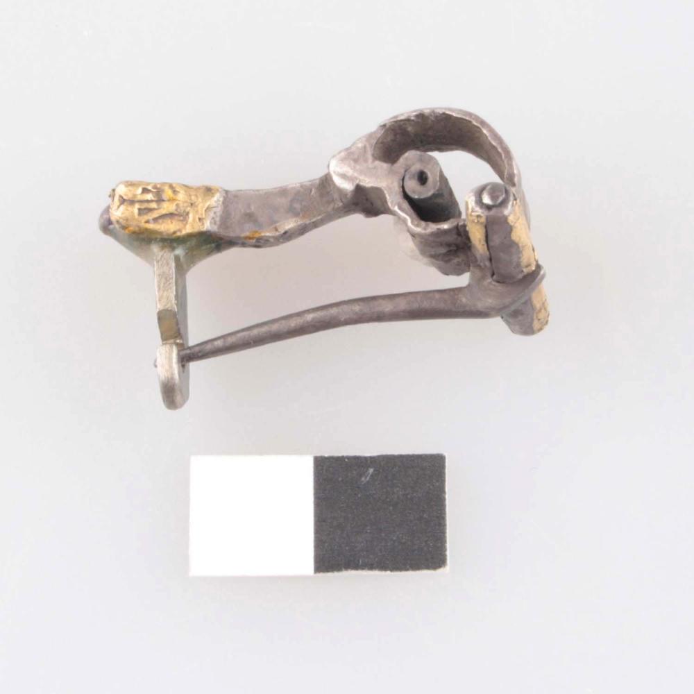Fibel aus Silber mit Nadel und teilweiser verzierter Goldblechwicklung, Nadelhalter modern ergänzt