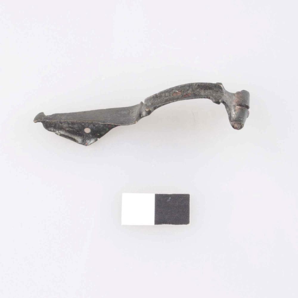 Zweigliedrige gestreckte Scharnierfibel mit schwach gewölbtem, breiten, bandförmigen, profiliertem Bügel mit Mittelrippe und vier kurzen, seitlich auslaufenden Fortsätzen; vom Bügel durch einen einfachen Wulst getrennt ist der langgezogene dreieckförmige Fuß, der einen einfach durchlochten, dreieckig geformten Nadelhalter trägt und mit einem gerade abgeschnittenen, flachen, dreieckförmigem Fußknopf abschließt; Scharnierkonstruktion vorhanden, Nadel fehlt, Verzinnungsreste erhalten.