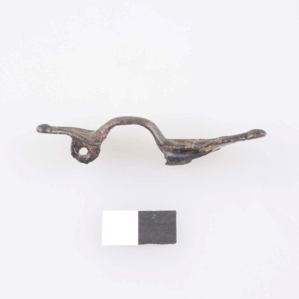 Bügelfibel, Buntmetall, Fibelkopf und Fuß kerbschnittverziert
