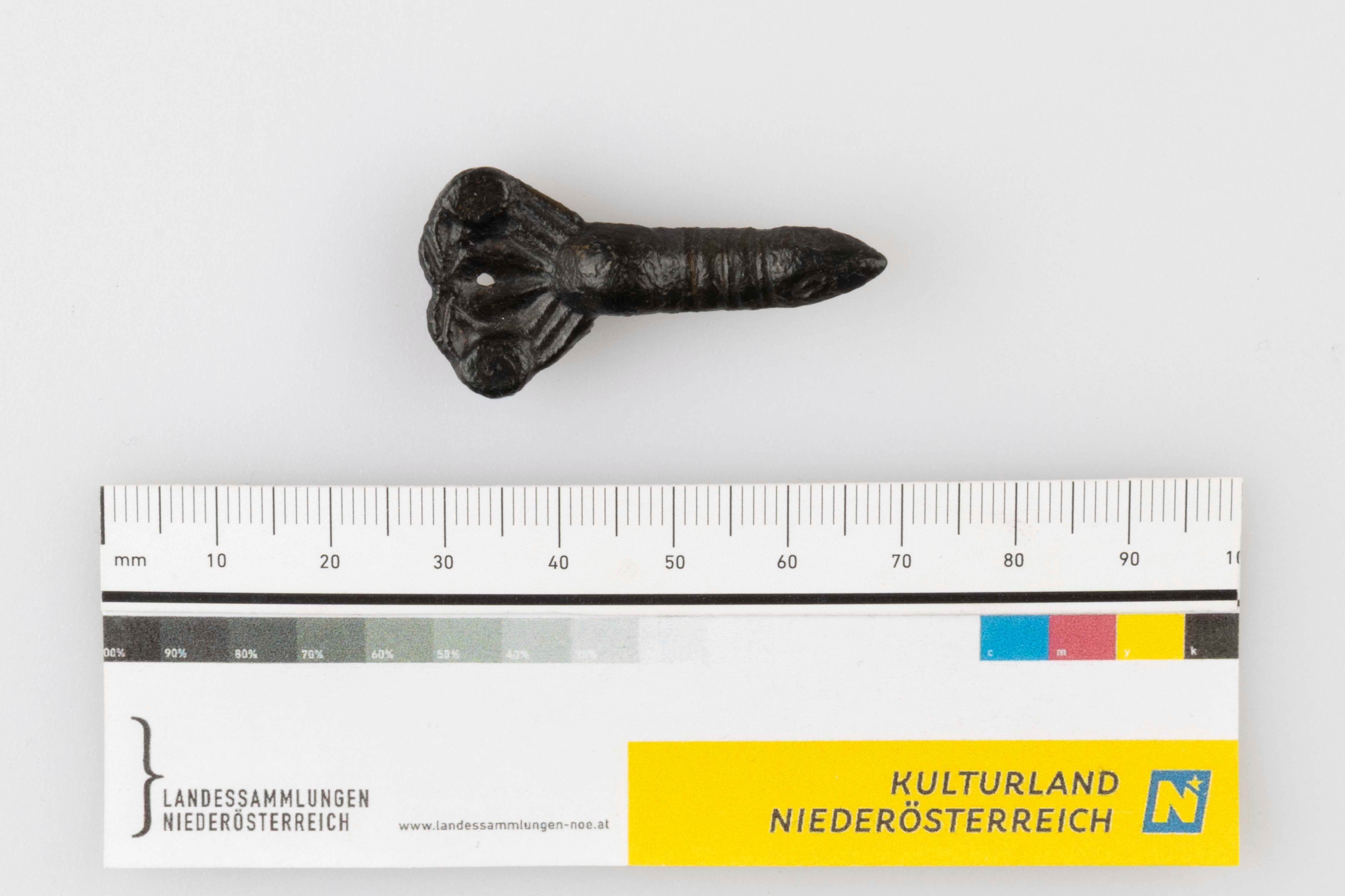 Die Fibel wurde aus Bronze gegossen und zeigt nach oben gerichtete Vogelköpfe. Das Stück ist mit Kerbschnitt verziert. Der Fuß ist quergerippt. Die Kopfplatte zeigt eine symmetrische Anordnung stilisierter, einander zugewandter Vogelköpfe. Die Konturen der Tiere sind als geritztes Relief mit erhabenen Rändern dargestellt. Der bandartige Fuß der Fibel endet in einem Tierkopf. Die Achse und die Nadel sind nicht erhalten.