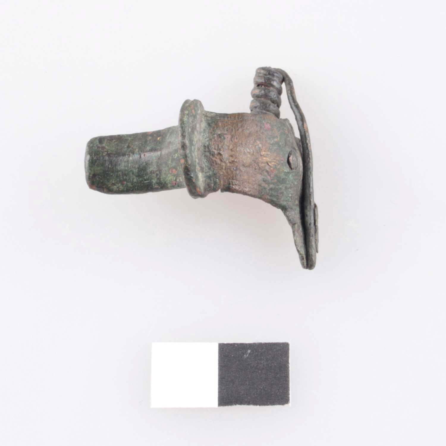 Rollenkappenfibel, Buntmetall, der östlichen Serie Form A37 mit zweilappiger Rollenkappe (abgebrochen), tremolierstichverziertem Bügel, scheibenförmigem, mit umlaufender Rille und Silberdraht gefülltem, an der Unterseite abgeflachtem Bügelknopf und kurzem, mit Grat versehenem Fuß; Sehnenkappe und Nadelhalter beschädigt; Spiralkonstruktion mittels Sift im Bügel befestigt, ein Teil der Spirale und Nadel fehlen.