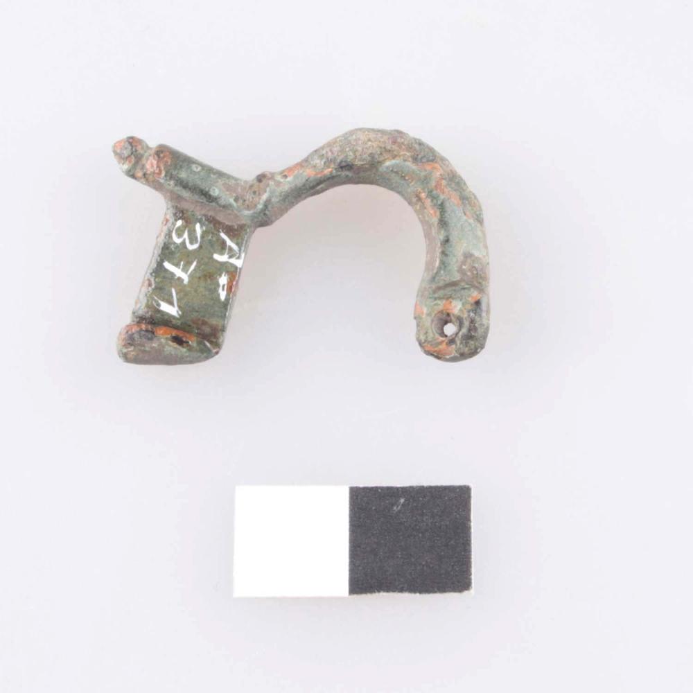 Zweigliedrige Armbrustfibel mit hohem Nadelhalter aus Buntmetall der Form A201. Bügel im Querschnitt D-förmig; Fuß durch eine Querrippe vom Bügel abgesetzt, Fußendknopf vom Fuß durch eine Querrille abgesetzt. Spiralkonstruktion und Nadel fehlen