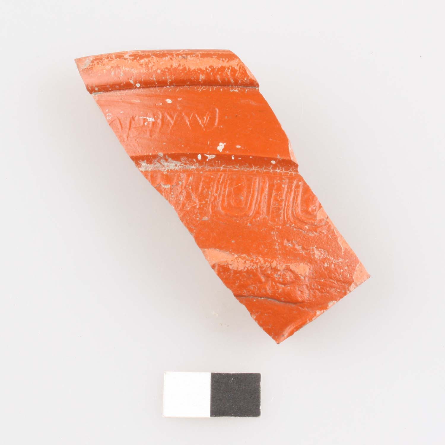 Wandstück, Terra Sigillata, mit Eierstabverzierung und Stempelresten