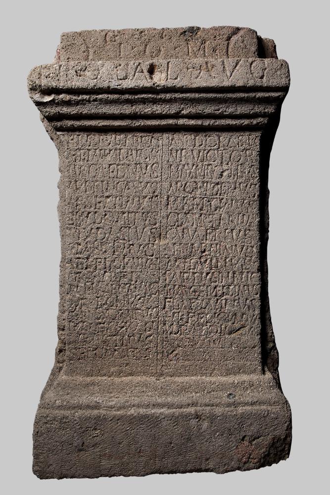 Die Platte zeigt in verkürzter Form ein altarförmiges Monument mit Weihinschrift, der eine Liste von Namen angefügt ist. Sie war in die Rückwand eines Amts- und Versammlungsraumes im Stabsgebäude (principia) des Legionslagers eingelassen und ist wohl eine Stiftung der in diesem Raum Dienst habenden Männern: